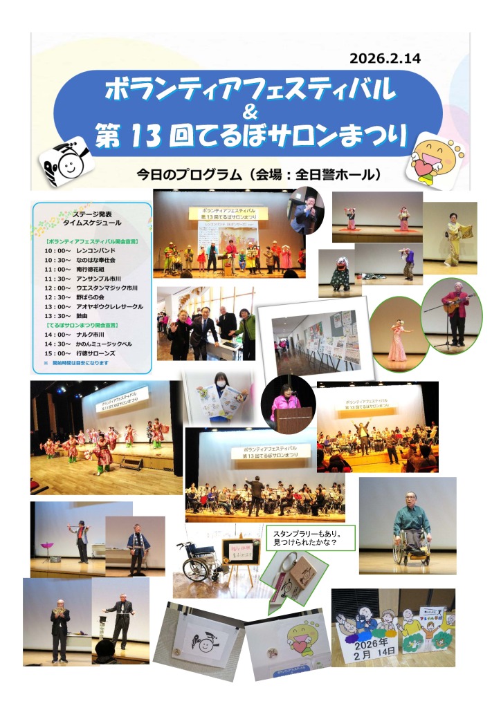 2/14 ボランティアフェスティバル開催しました 2026年2月28日 最終更新日時 : 2026年2月28日 管理者 ボラ協の会員グループの活動発表の場として、大きな会場で行えていなかった「ボラフェス」を、2026年2月14日に開催しました。 当日の様子 ボランティアフェスティバル2026ダウンロード